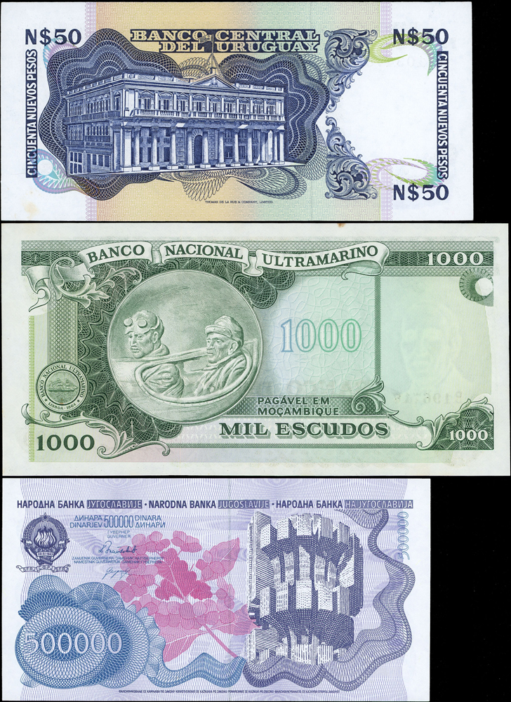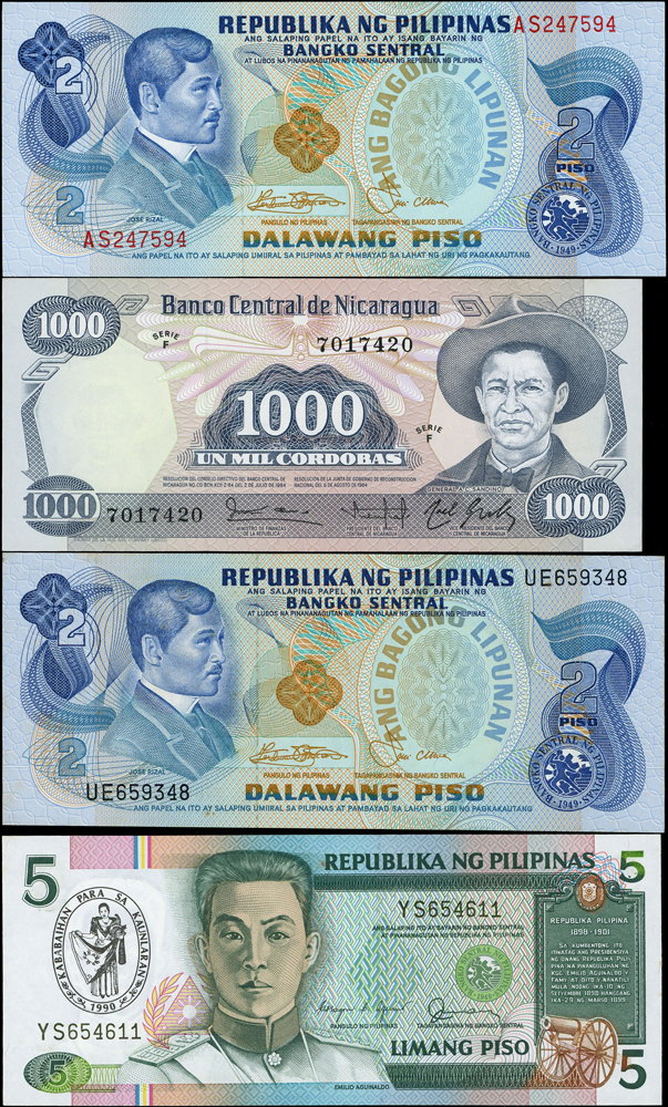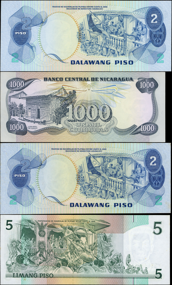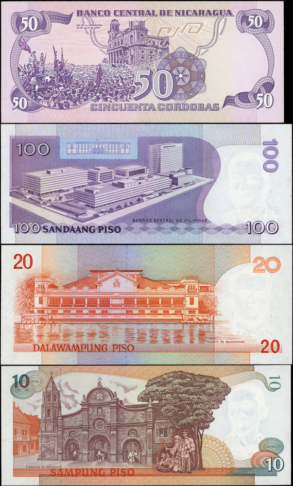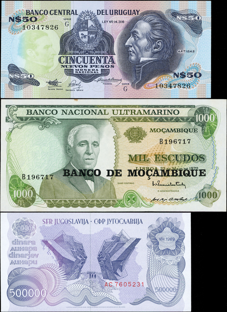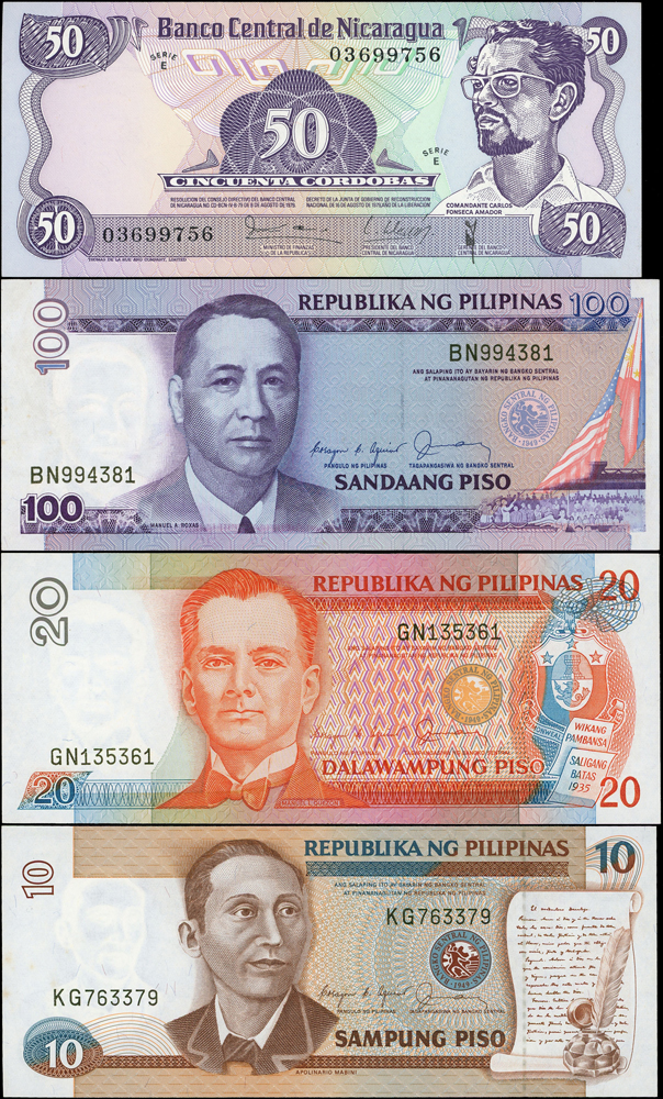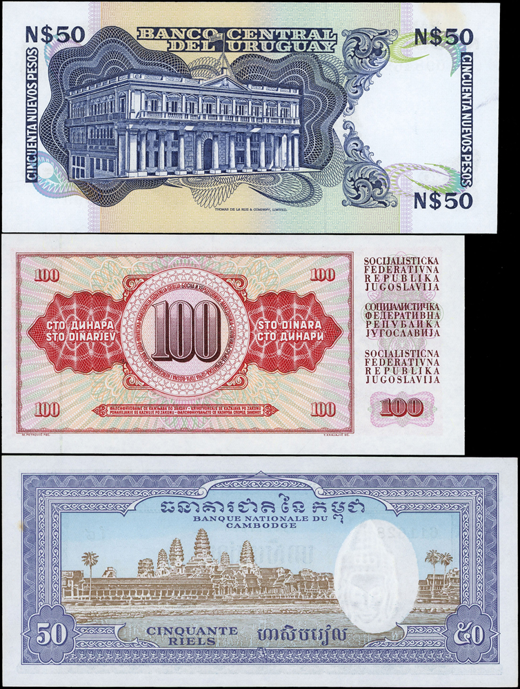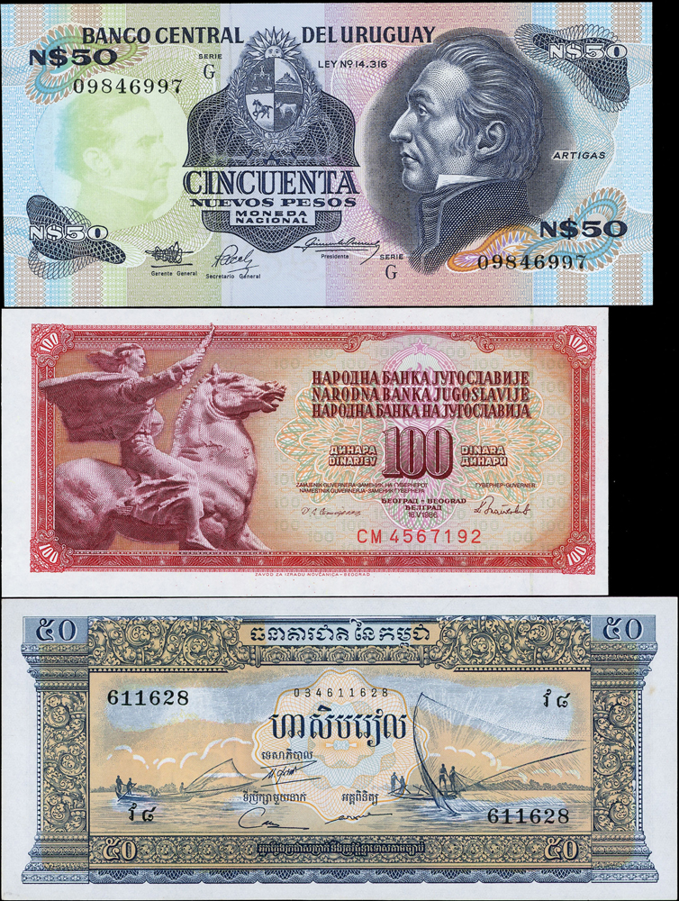 各國鈔票一組共47枚,或有重複,國家包括有:尼加拉瓜.菲律賓.南斯拉夫.義大利.莫三比克.烏拉圭.厄瓜多.斯洛維尼亞.委內瑞拉.智利.柬埔寨.尼泊爾.朝鮮等,除朝鮮三枚多皺褶約75-80新外,其餘約95-全新