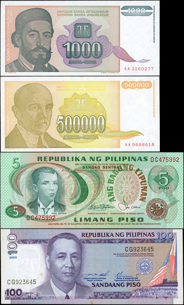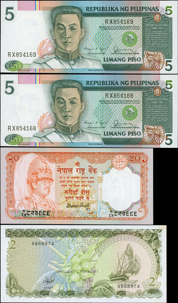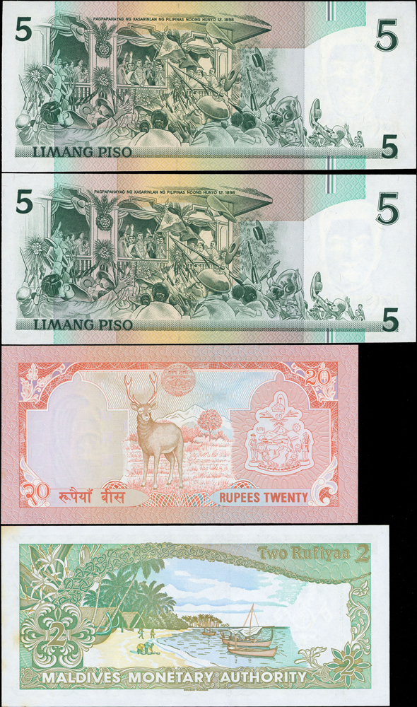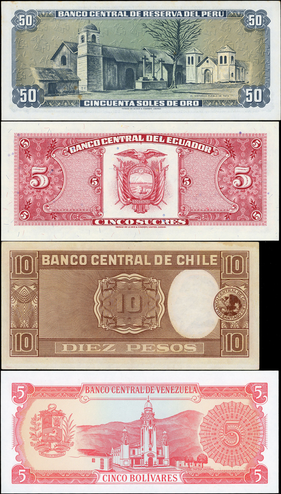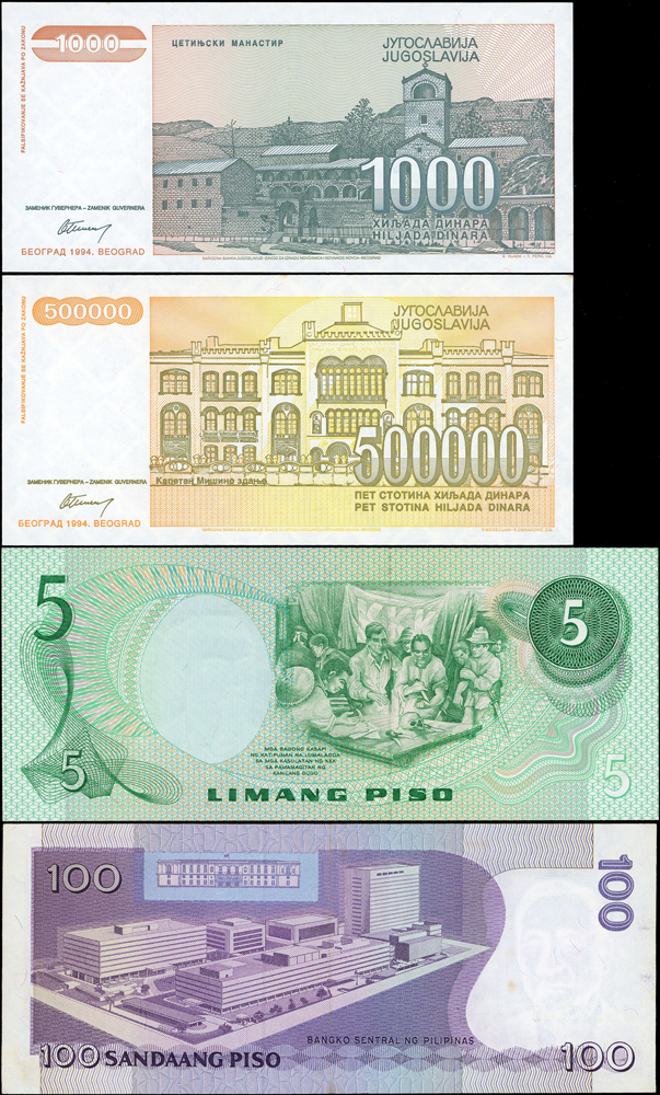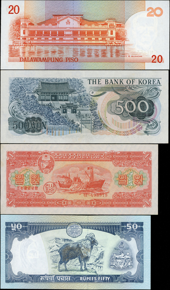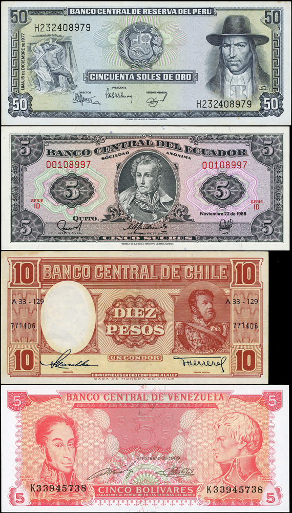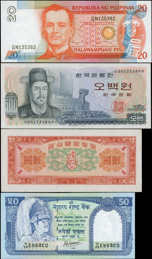 各國鈔票一組共47枚,或有重複,國家包括有:尼加拉瓜.菲律賓.南斯拉夫.義大利.莫三比克.烏拉圭.厄瓜多.斯洛維尼亞.委內瑞拉.智利.柬埔寨.尼泊爾.朝鮮等,除朝鮮三枚多皺褶約75-80新外,其餘約95-全新