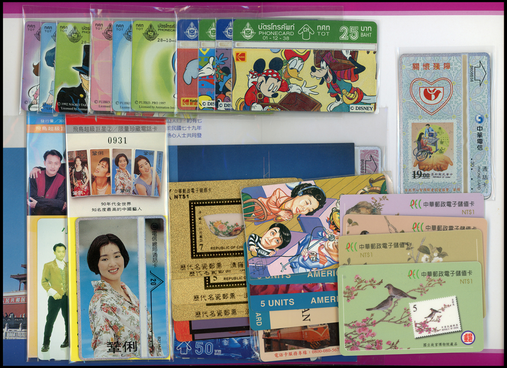 各國各式卡,均未使用,包括:(1)泰國訂製電話卡11張,含:1997年<哆啦A夢>3張全(總面值計THB$250銖);1996年<迪士尼米老鼠>4張全(總面值計THB$150銖);1992年<美少女戰士>3張全(總面值計THB$250銖);<百事可樂-BLUE CLUB>1張全(面值計THB$50銖);(2)中華卡友會美國卡:1993年門神(六單位)電話卡2張全,1994年恐龍(八單位)電話卡2張全,1994年我愛台灣(三單位)電話卡1張全;(3)台南市郵學會贈-赤崁樓圖中華電信20元IC電話卡;(4)中華郵政電子儲值卡-鳥譜圖4張全,清雍正琺瑯彩瓷4張全,共2套,每張面值NT$1;(5)日本發行:香港文化中心協會-鬼馬餐廳50單位電話卡,小虎隊50單位電話卡;(6)中華電信關愛協會愛心30元訂製電話卡2卡全,附原封套;電信總局鞏俐20元訂製電話卡1卡全;(7)廣東省郵電管理局發行-中港傳呼聯網開啟紀念CNY$30元電話卡1卡全;歡迎至官網瀏覽全貌(Page 92)