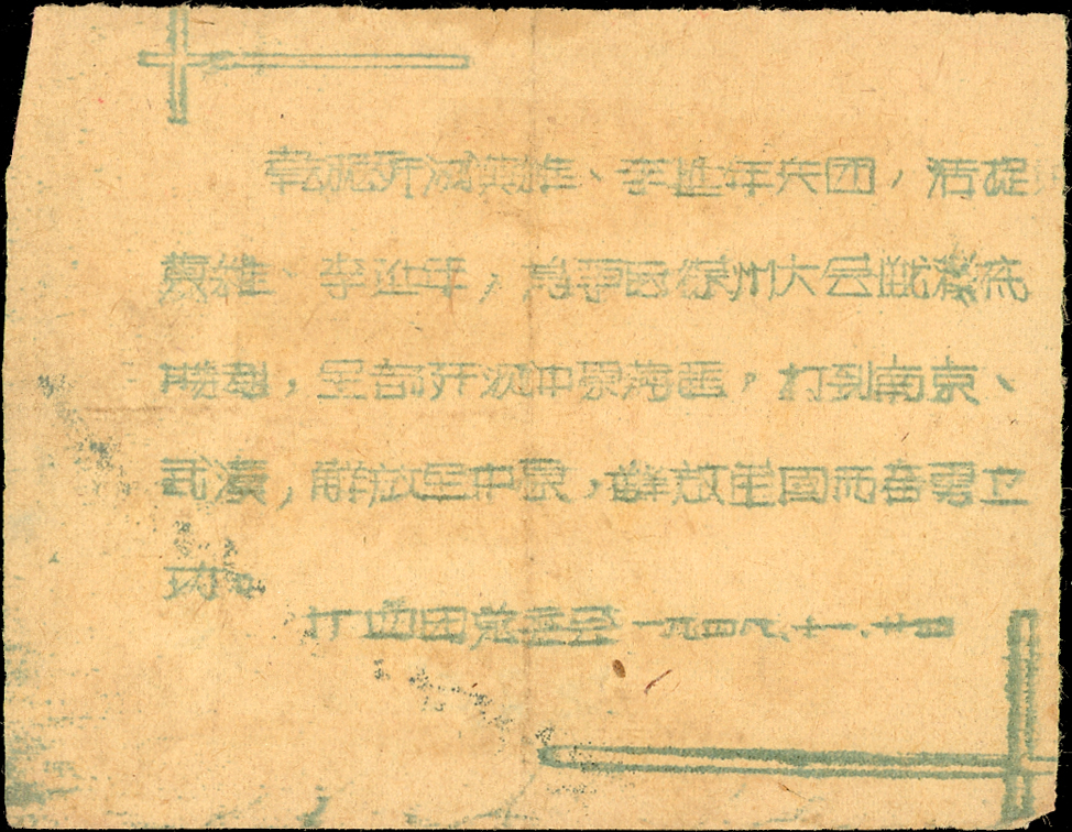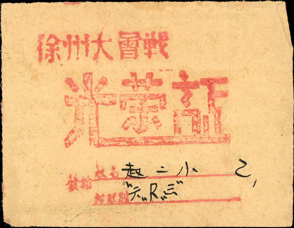徐州大會戰文獻二件:(1)1948年徐州大會戰光榮証(8*6.3cm)一件,已使用;(3)徐州大會戰光榮紀念証(10.3*23cm)一件,已使用,中國人民解放軍中野六縱隊十七旅製,破損,50新(Page 93)